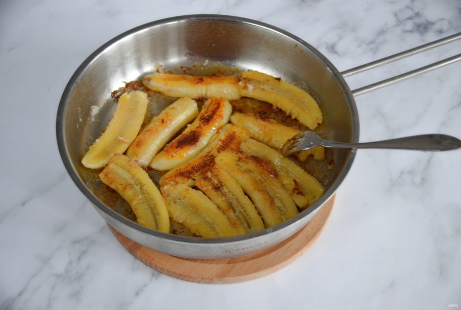 Разогрейте сковороду, когда сахар начнет карамелизоваться, выложите бананы, нарезанные вдоль и обжарьте их с двух сторон.