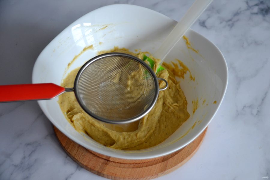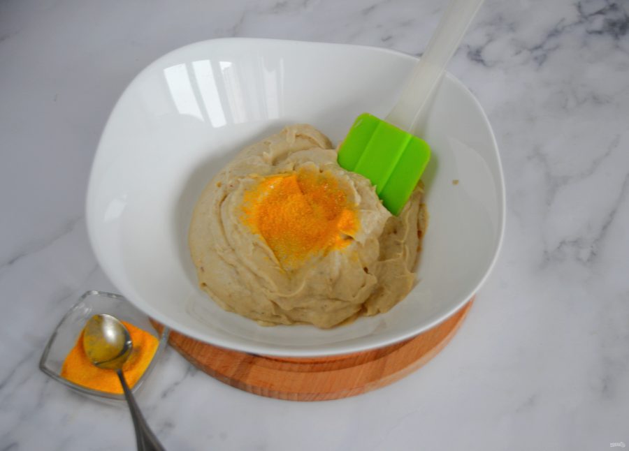Добавьте в сливочно-банановую массу ванильный сахар. В рецепте использован желтый ванильный сахар с экстрактом сафлора, можно использовать любой ванильный сахар. При желании можно добавить небольшое количество куркумы для получения более яркого цвета.