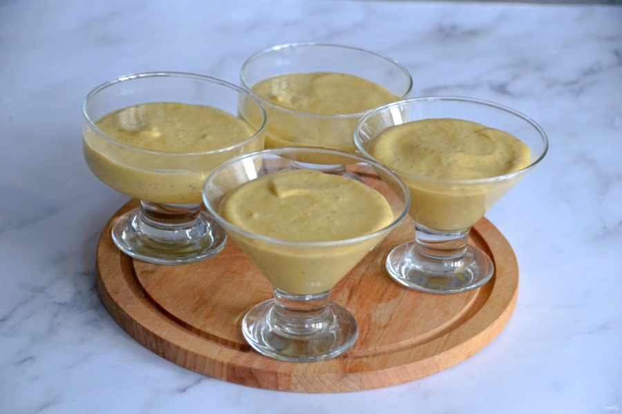 Растопите желатиновую массу в микроволновой печи в течение 30 секунд, не доводя до кипения. Добавьте растопленную желатиновую к сливочно-банановой массе, процедите ее через ситечко, смешайте.