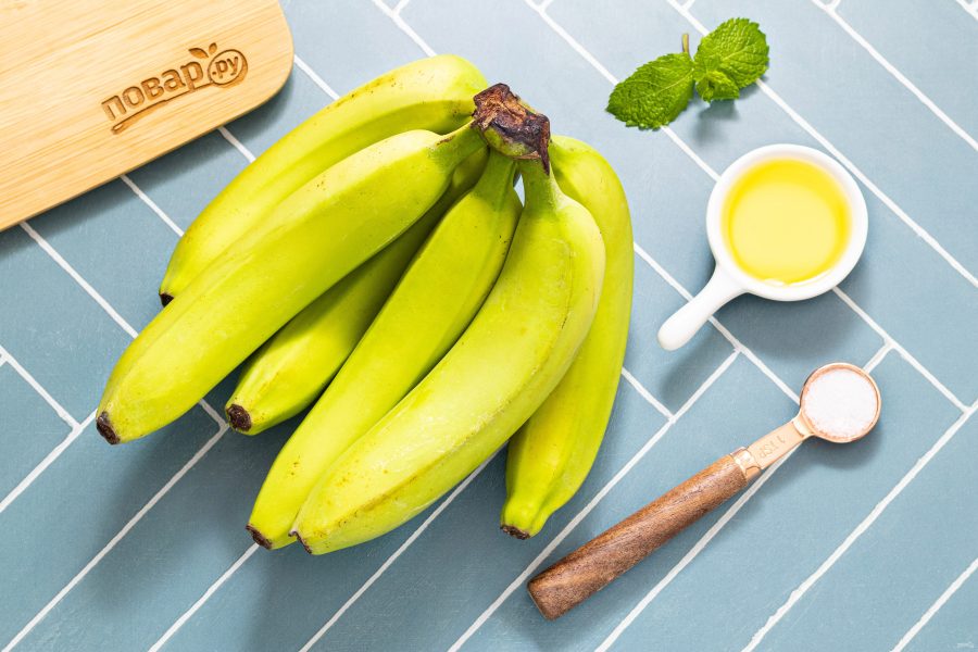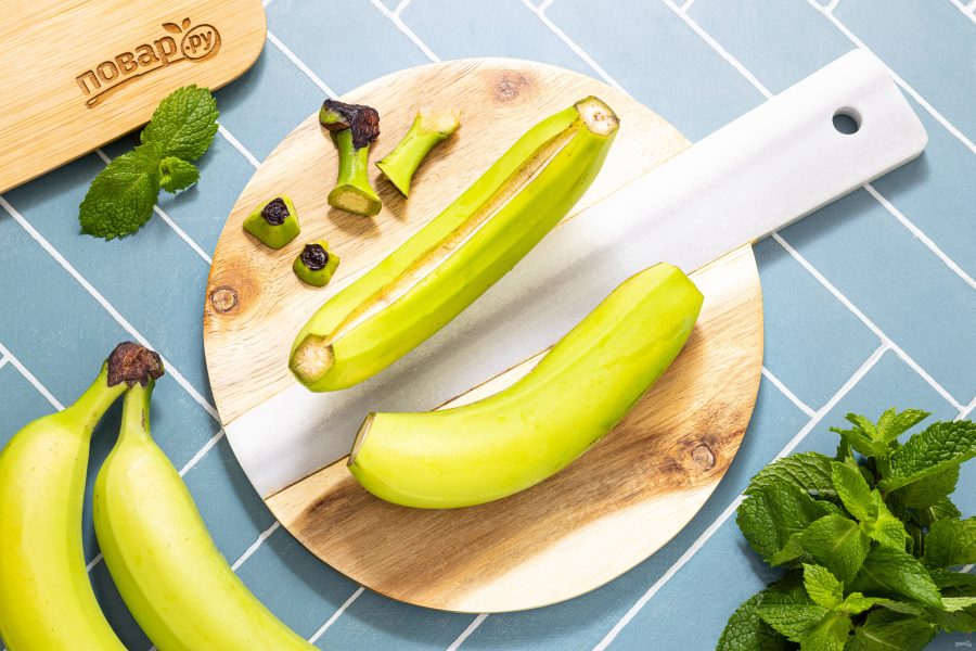 Бананы помойте, отрежьте кончики с двух сторон и сделайте надрез на кожуре вдоль. Таким образом зеленый банан будет проще очистите от кожуры.