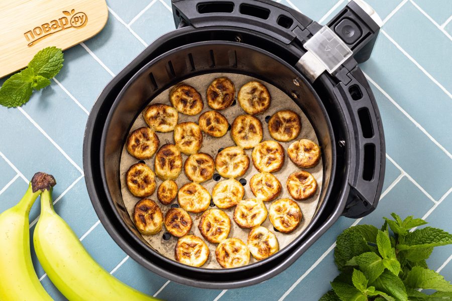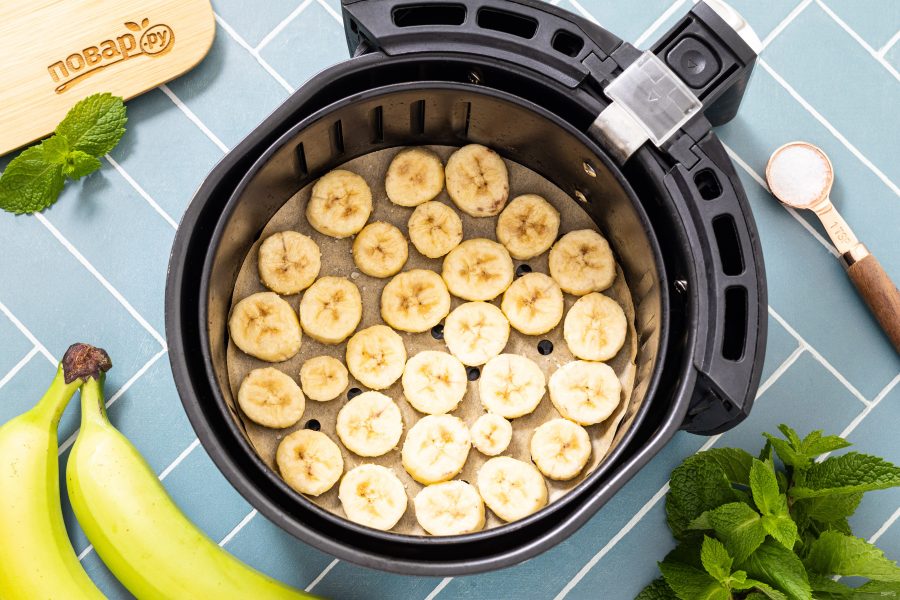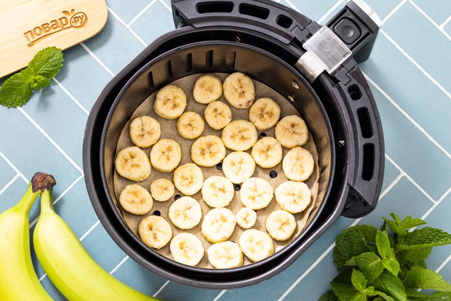 Аэрогриль предварительно разогревайте 3 минуты на температуре 180 градусов. Выложите в один слой кружочки бананов в корзинку или решетку аэрогриля.
