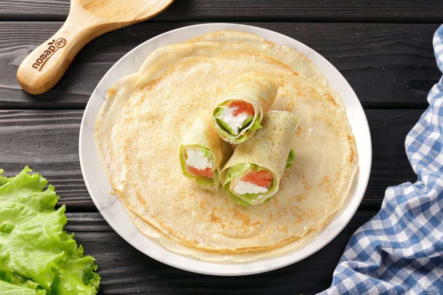 Подготовьте все ингредиенты по списку. Красную рыбу можно взять любую: горбушу, сёмгу, кету, форель. Рыбу можно как купить готовую, так и засолить самостоятельно. Блины вы можете сделать своим любимы способом, главное, не делайте их очень сладкими.