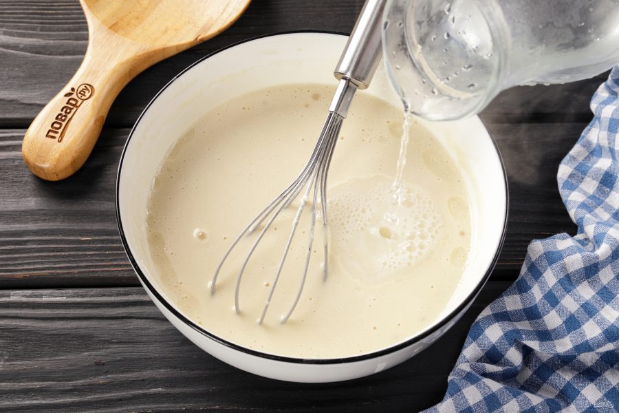Перемешайте и тонкой струйкой влейте кипяток, не переставая мешать.