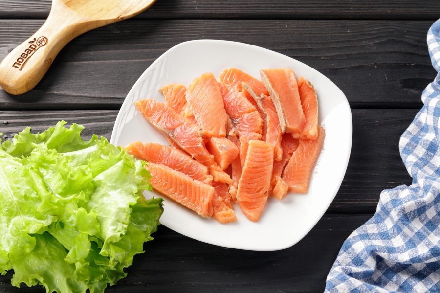 Если у вас солёная рыба в виде стейка, то проще нарезать её брусками, а если она крупным куском, то либо — так же брусками, либо — тонкими ломтиками. Листья салата промойте и обсушите.