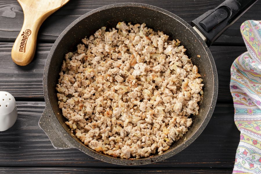 Когда фарш будет готов, добавьте в сковороду отварной рис. Все смешайте и снимите сковороду с огня. Остудите начинку до теплого состояния.