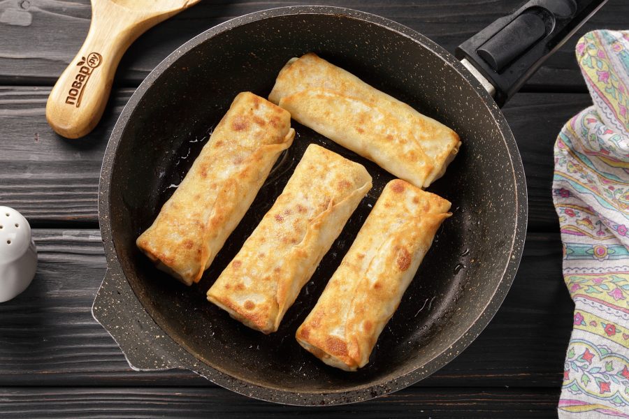 Блинную сковороду перед первым блином немного смажьте растительным маслом. Тесто наливайте тонким слоем.