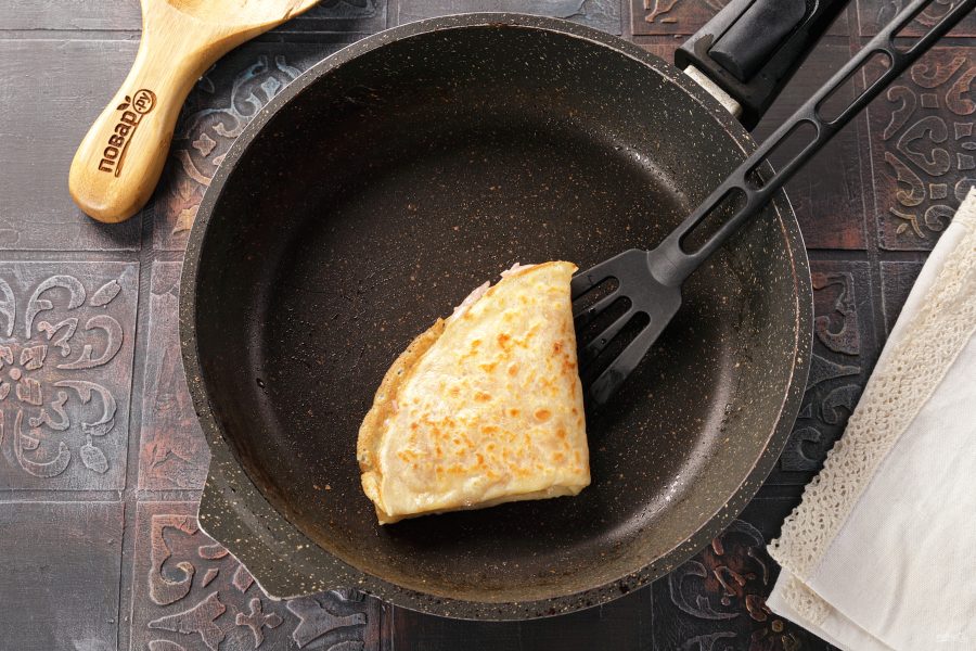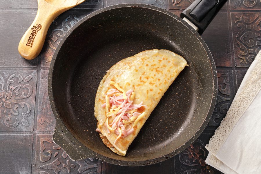 Сложите блин пополам и немножко прижмите лопаточкой. Сыр должен начать плавиться.