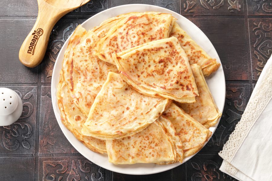 Выкладывайте блинчики на большую плоскую тарелку. Блины с ветчиной готовы.
