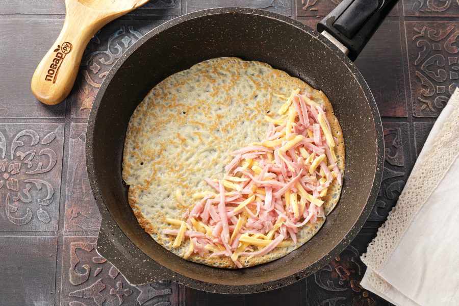 Сразу, пока вторая сторона не зарумянилась, выложите на блинчик сыр и ветчину. Начинка должна занять половину блина.