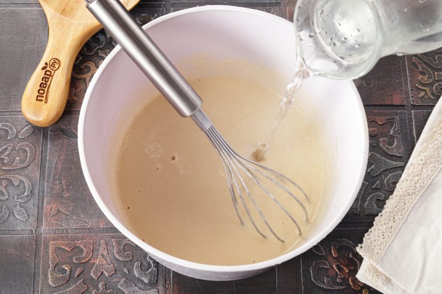 Вскипятите воду и тонкой струйкой влейте в тесто при непрерывном помешивании.