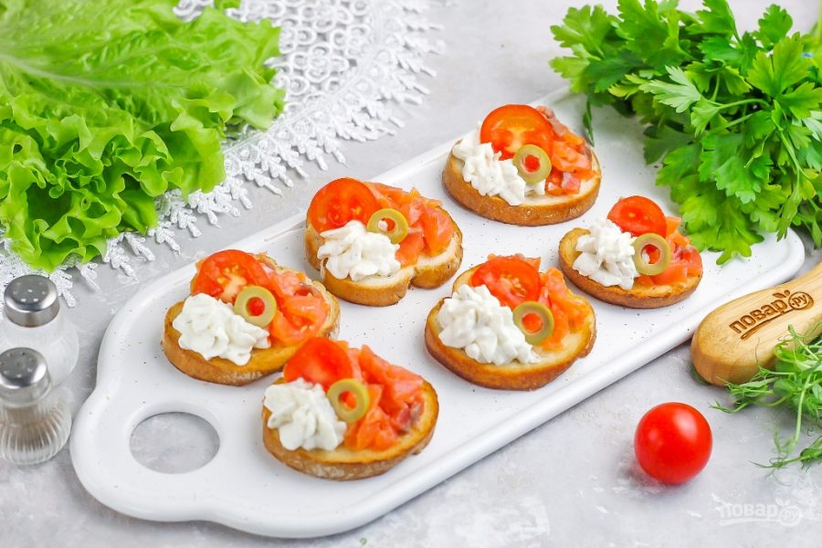 Для экономии своих сил и времени перед праздником приобретайте слабосоленую нарезку семги в магазине или супермаркете вместе с нарезанным багетом, батоном. По желанию можно купить уже готовые обжаренные порционные гренки. Оливки или маслины выбирайте без косточек, а помидоры черри вы с легкостью можете заменить свежим огурцом. Помните, что подавать брускетты к столу нужно сразу же после выкладывания на них начинки, пока они не размокли.Состав / Ингредиенты: