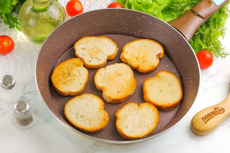 Разогрейте сковороду и выложите на нее ломтики багета, обжарьте на среднем нагреве по 1-2 минуты с каждой стороны. Если хотите получить более сочные основы, то влейте на сковороду немного растительного масла или растопите на ней кусочек сливочного масла и обжарьте в жире ломтики хлеба. Обязательно остудите их в течение 10 минут.
