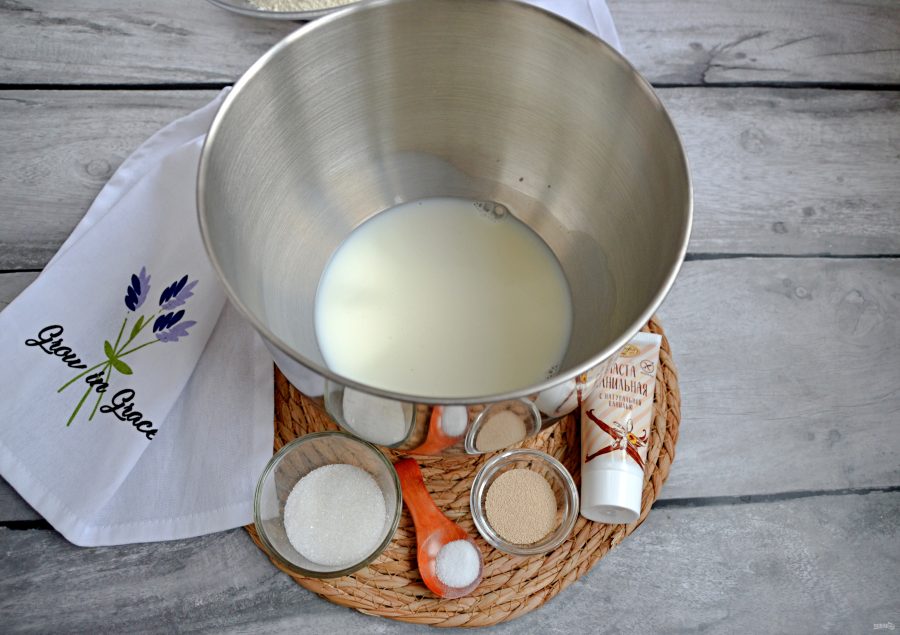 В теплом молоке растворите дрожжи, добавьте соль, сахар, ваниль.