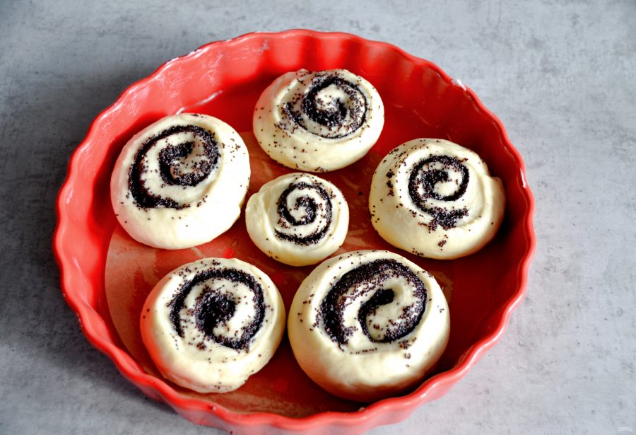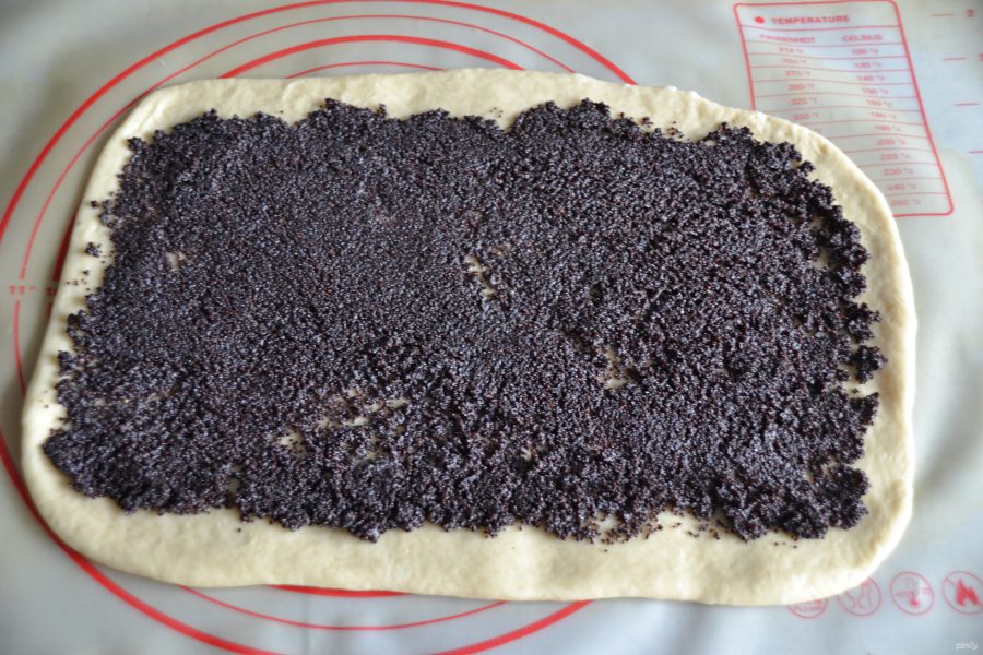 Для приготовления булочек вторым способом смажьте маковой начинкой всю поверхность теста, не доходя до края примерно 3-5 см.