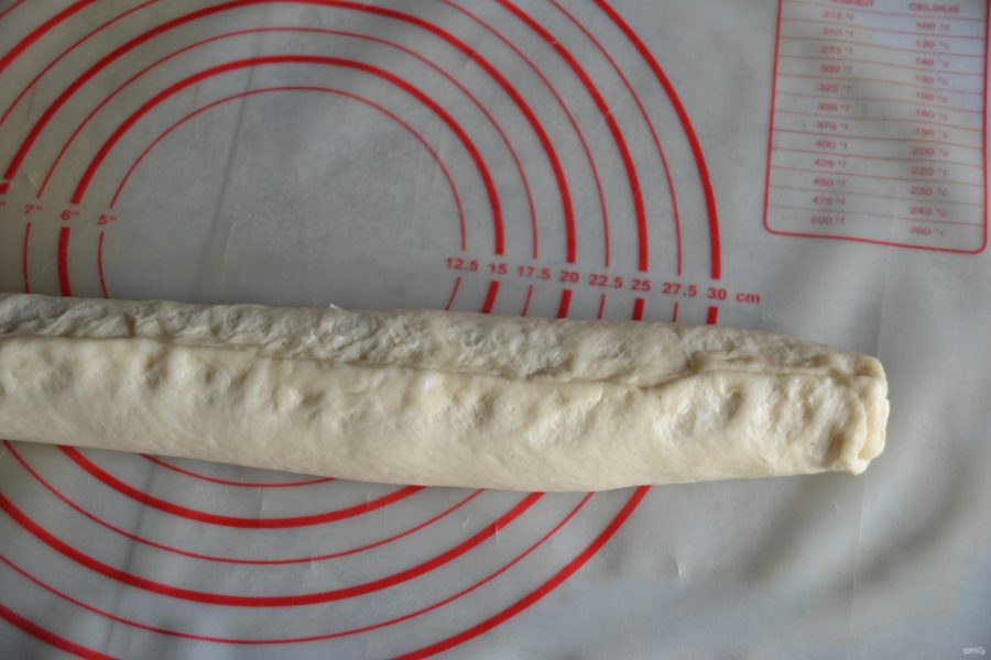 Сверните тесто в рулон, помогая себе силиконовым ковриком.