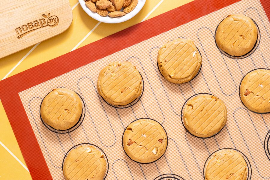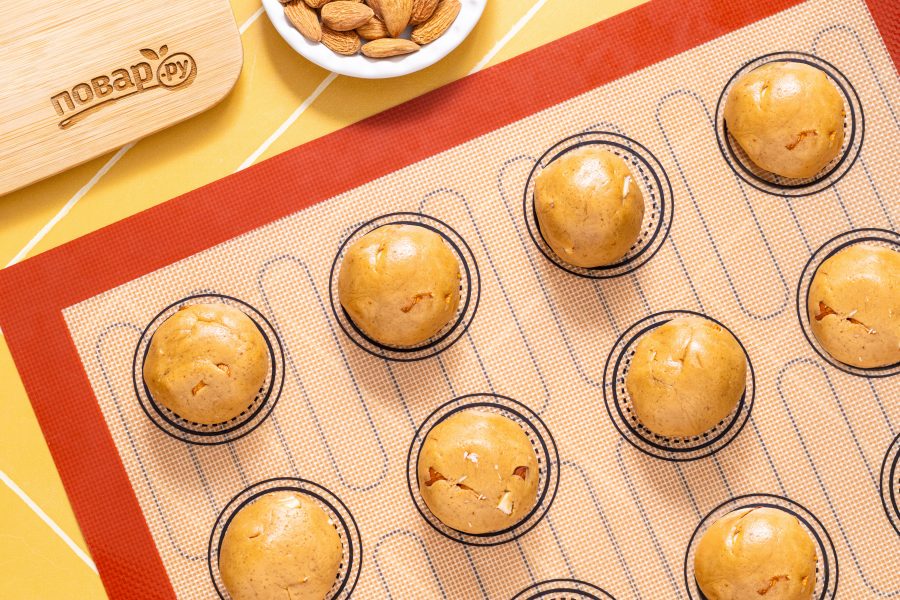 Скатайте из теста шарики одинакового размера. Выложите на пергамент или коврик для выпечки на расстоянии примерно 5 см. друг от друга.