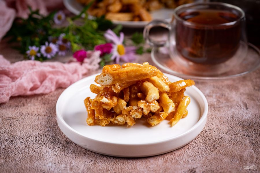 обжаренных кусочков теста, к ним залейте пару ложек сиропа, все перемешайте. Затем