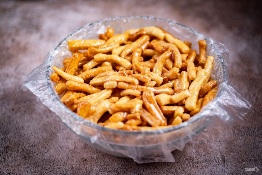 Готовый чак-чак выложите из формы, удалив пищевую пленку, на плоское блюдо и