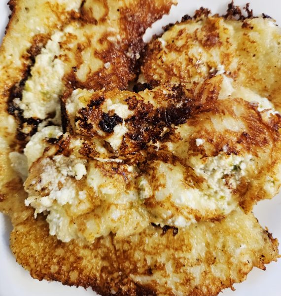 5. В хорошо разогретое растительное масло выложите ложку картофельной массы, а сверху— творог. На творог выложите еще ложку картофельного теста. Обжаривайте с обеих сторон до золотистого цвета.