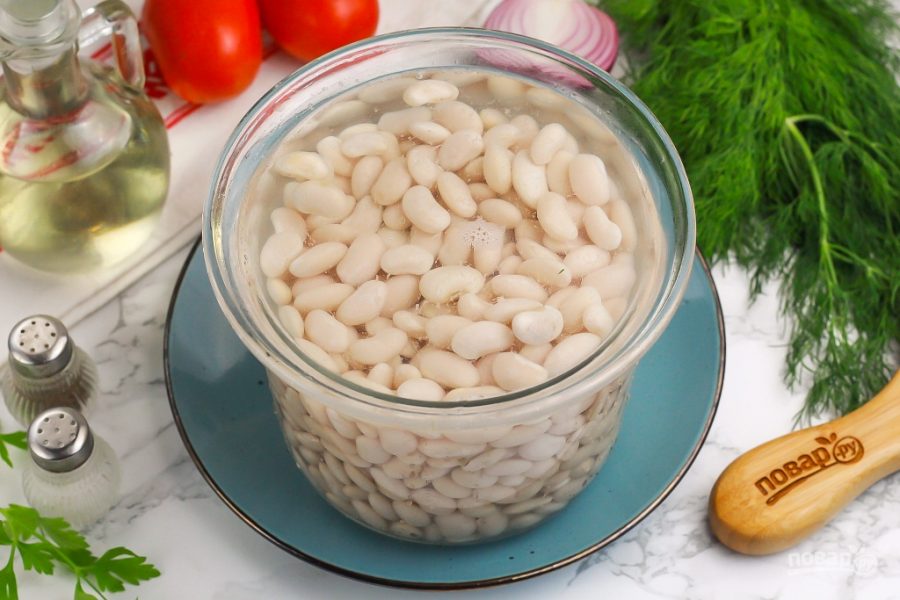 Промойте фасоль в воде, высыпьте в глубокую емкость. Залейте горячей водой, чтобы она покрыла бобовые полностью и на два пальца уровень жидкости должен быть выше. Оставьте фасоль на 4-8 часов для набухания.
