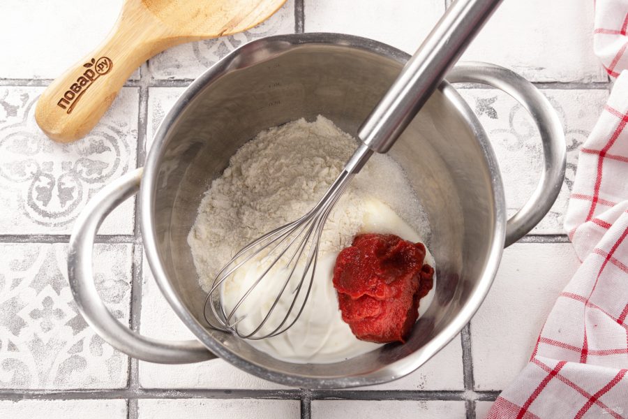 В небольшой кастрюльке или сотейнике соедините муку, томатную пасту и сметану. Добавьте соль по вкусу. Можно добавить 1-2 щепотки сахара для более сбалансированного вкуса.
