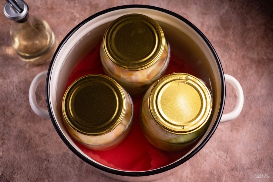 и дождитесь момента закипания воды. После чего стерилизуйте заготовку 15-20 минут.