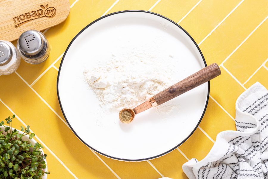 Обваляйте кабачки с двух сторон в муке с крахмалом. Излишки стряхните.