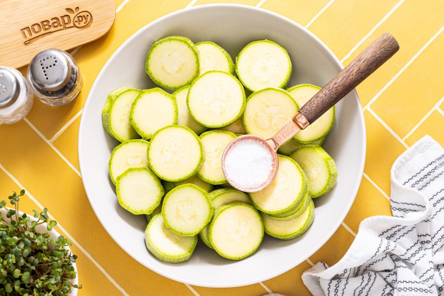 Перемешайте и оставьте на 10 минут, чтобы они выделили жидкость. Жидкость слейте, а кабачки обсушите с помощью бумажных салфеток.