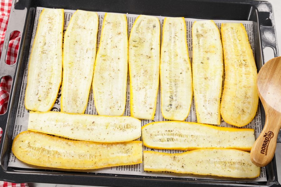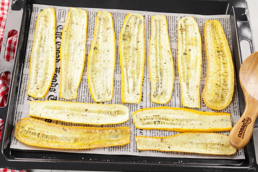 Кабачок вымойте, обсушите и нарежьте на тонкие полоски. Если сложно нарезать ножом, воспользуйтесь овощечисткой. Выложите в один ряд на застеленный пергаментом и смазанный маслом противень. Посыпьте сверху солью (у меня адыгейская) и отправьте в разогретую до 180-200 градусов духовку.