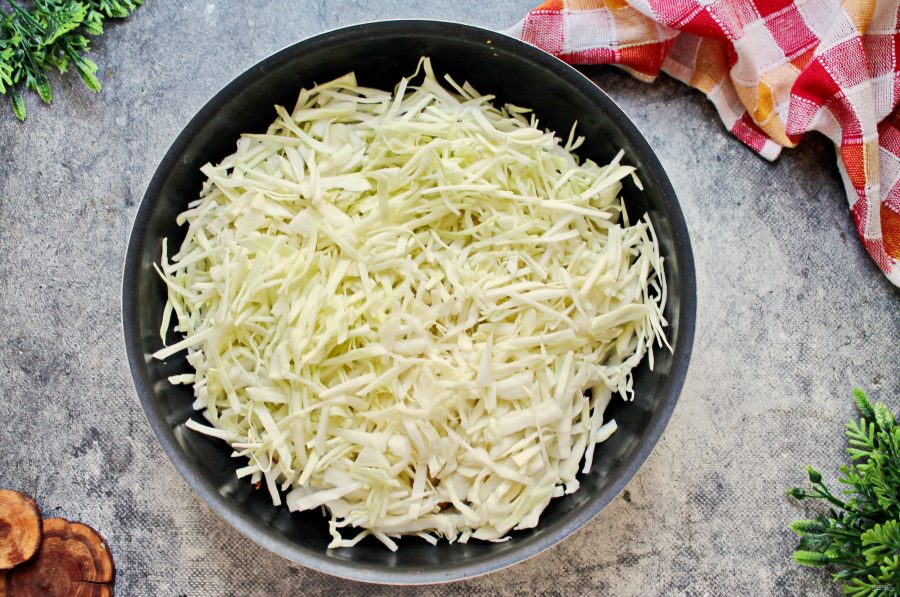 Капусту нарежьте средней соломкой и выложите в сковороду. Перемешивая, обжаривайте в течение 5-6 минут.