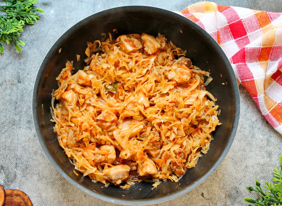 Закройте сковороду крышкой и на медленном огне готовьте в течение 30-40 минут, до желаемой готовности капусты.