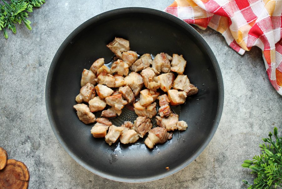 Свинину сполосните, обсушите бумажным полотенцем и порежьте средними кусками. В глубокую сковороду налейте растительное масло и разогрейте на среднем огне. Увеличьте огонь, выложите мясо и обжаривайте, перемешивая, до румяной корочки. Убавьте огонь, влейте в сковороду 100 миллилитров воды, закройте крышкой и готовьте в течение 15 минут. Следите, чтобы мясо не пригорело.