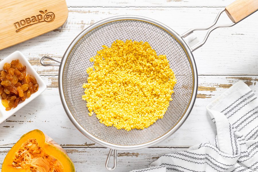 Пшено промойте несколько раз в воде до прозрачности. Ошпарьте кипятком, чтобы убрать горечь и после откиньте на сито.