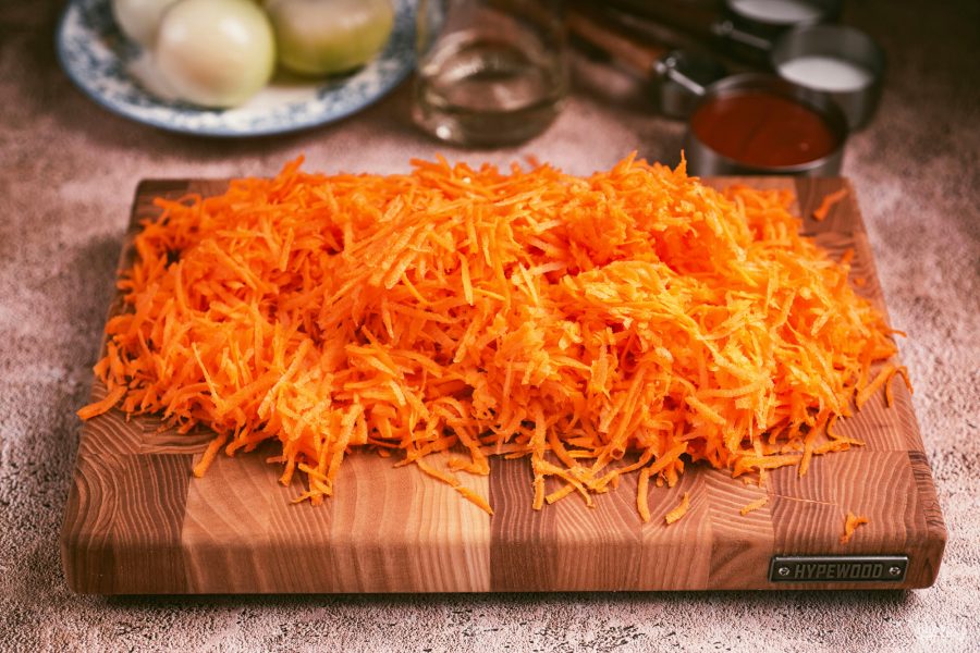 Лук и морковь выложите в глубокую сковороду, в которую предварительно налили 50 мл.