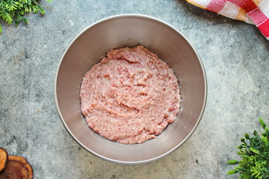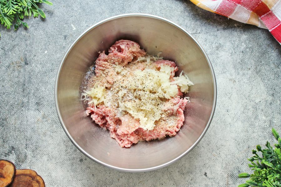Все хорошо перемешайте и оставьте постоять в течение 20 минут. Если фарш получится слишком потный, добавьте немного холодной воды для сочности, после этого отбейте фарш до плотности. Для этого соберите фарш в ладонь, поднимите его над миской и бросьте обратно. Сделайте так 10-15 раз, фарш должен стать пластичным и однородным. Это позволит легко сделать котлеты, и они не развалятся во время приготовления.