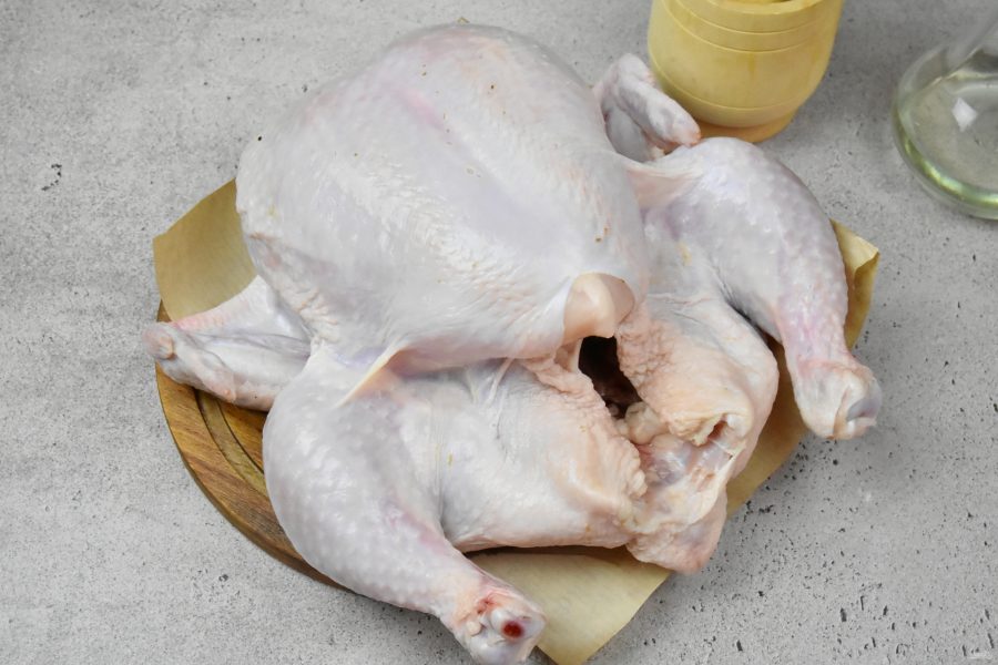 В первую очередь обработайте курицу. Удалите лишний жир, остатки перьев. Промойте и просушите тушку от лишней влаги бумажными полотенцами.