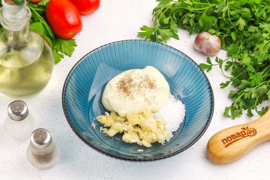 В пиале или миске соедините майонез любой жирности, соль и молотый черный перец. Очистите зубчики чеснока, спрессуйте в майонез и залейте все горячей водой.