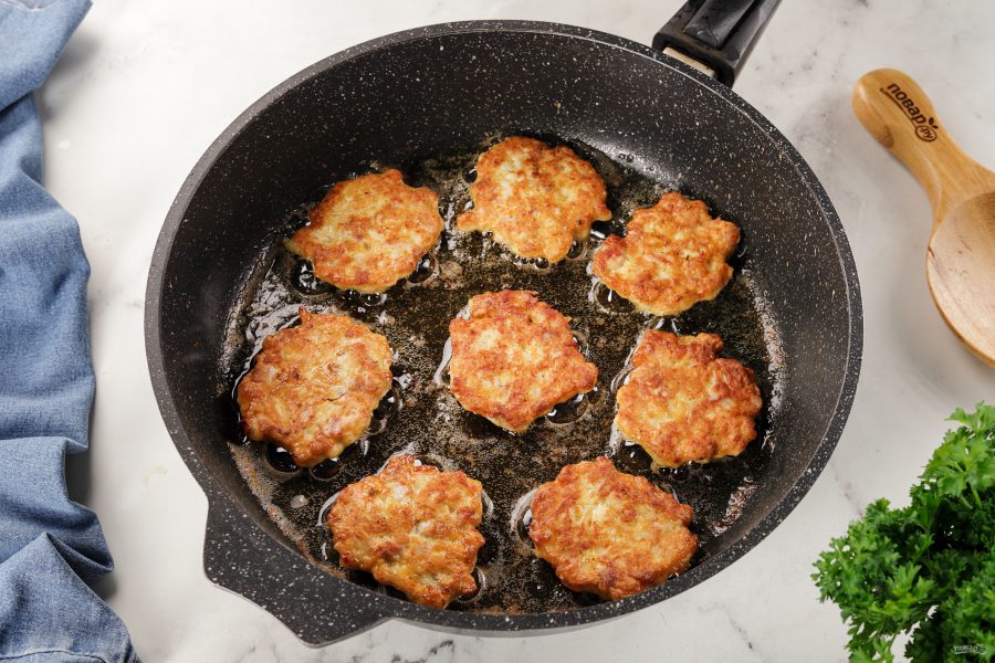 В сковороде на среднем огне разогрейте растительное масло. Столовой ложкой выложите в раскаленное масло куриную массу и формируйте небольшие котлетки.