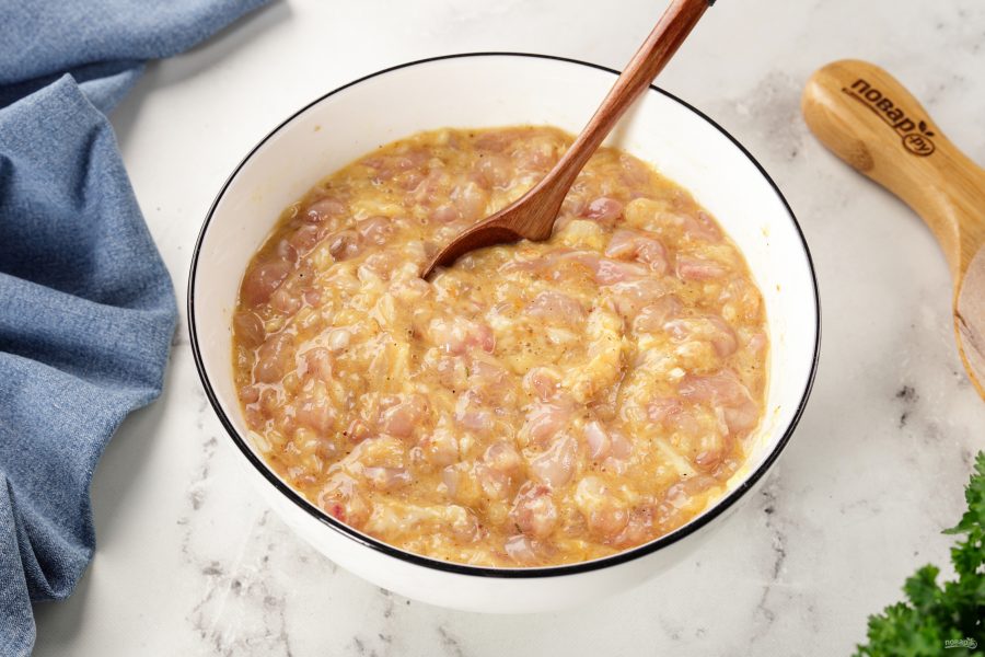 Куриное филе вымойте, обсушите, удалите пленки и кусочки жира. Мясо нарежьте очень мелкими кубиками. Вместо куриного филе с грудки можете использовать мясо с бедра.