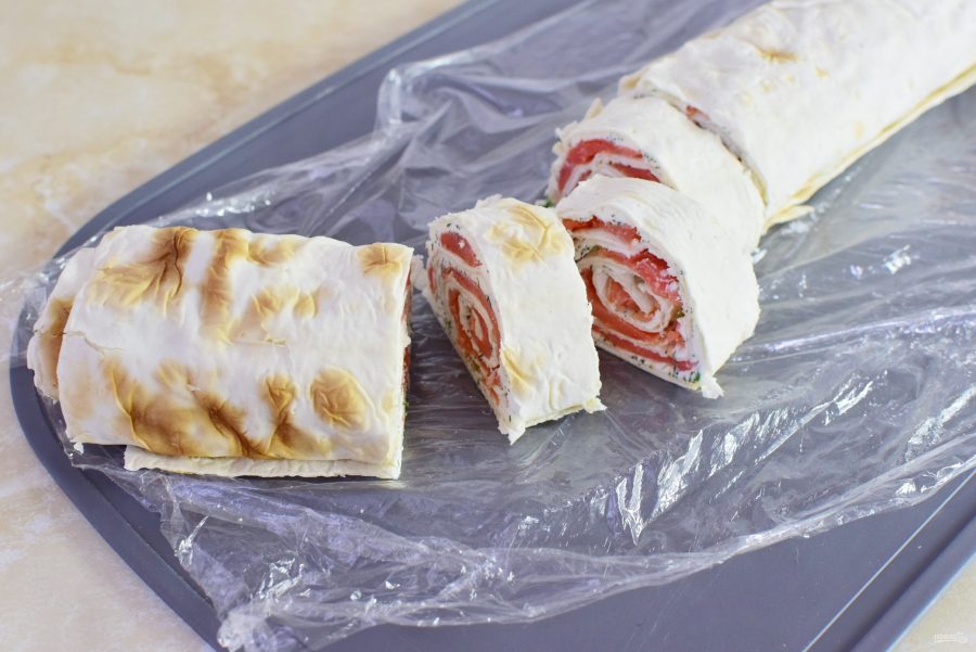 Быстрая и простая закуска из лаваша — рулет с рыбой и сыром. Начинка из красной рыбы всегда смотрится очень выигрышно на любом застолье. Дополните начинку любимыми специями.