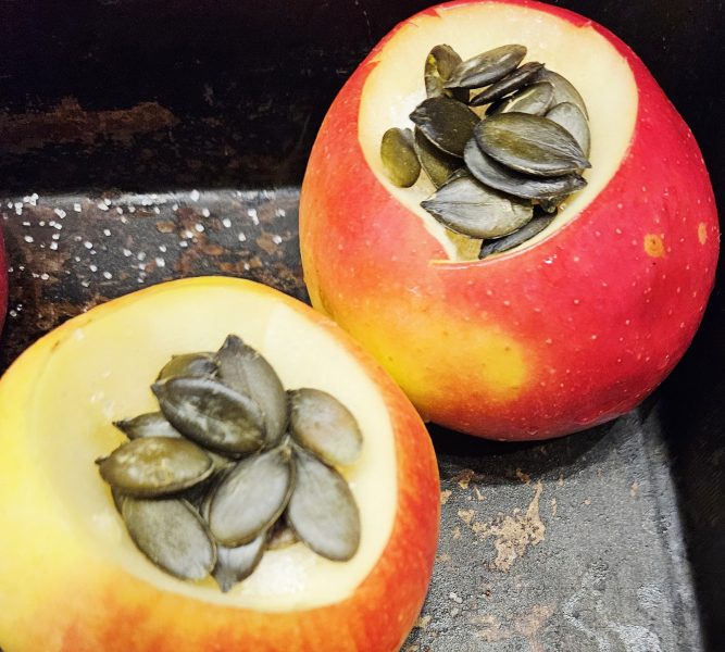 Запек яблоко с медом и тыквенными семечками -получилось очень вкусно.