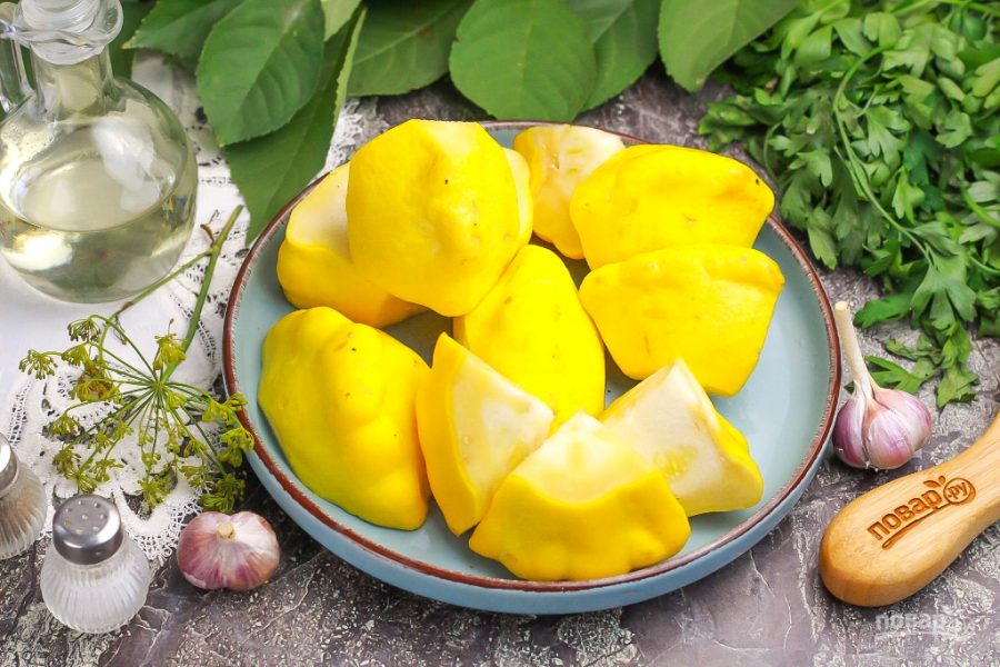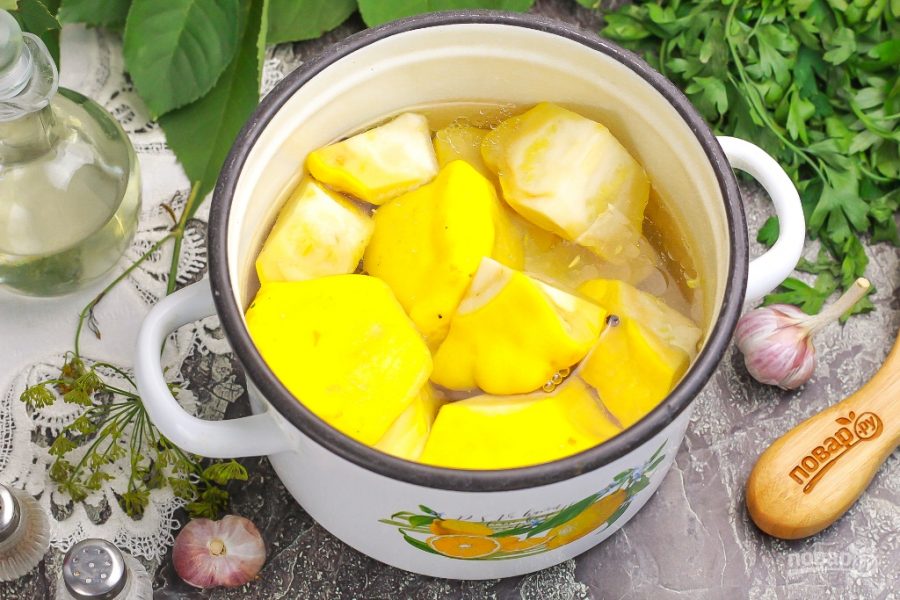 Пока жидкость закипает, нарежьте патиссоны крупными кусочками. Если они мелкие, то можно просто разрезать пополам или на четыре части.