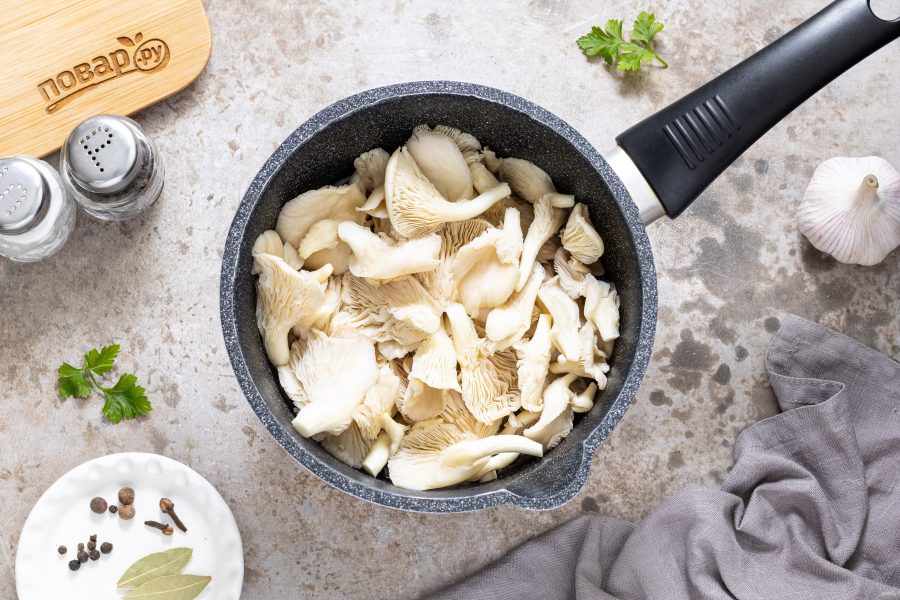 Вешенки быстро промойте от загрязнений и обсушите с помощью бумажных салфеток. Отрежьте нижнюю часть корня, разделите на отдельные грибы. Очень крупные можно разрезать пополам, но учитывайте, что после варки они все равно уменьшатся в размере.