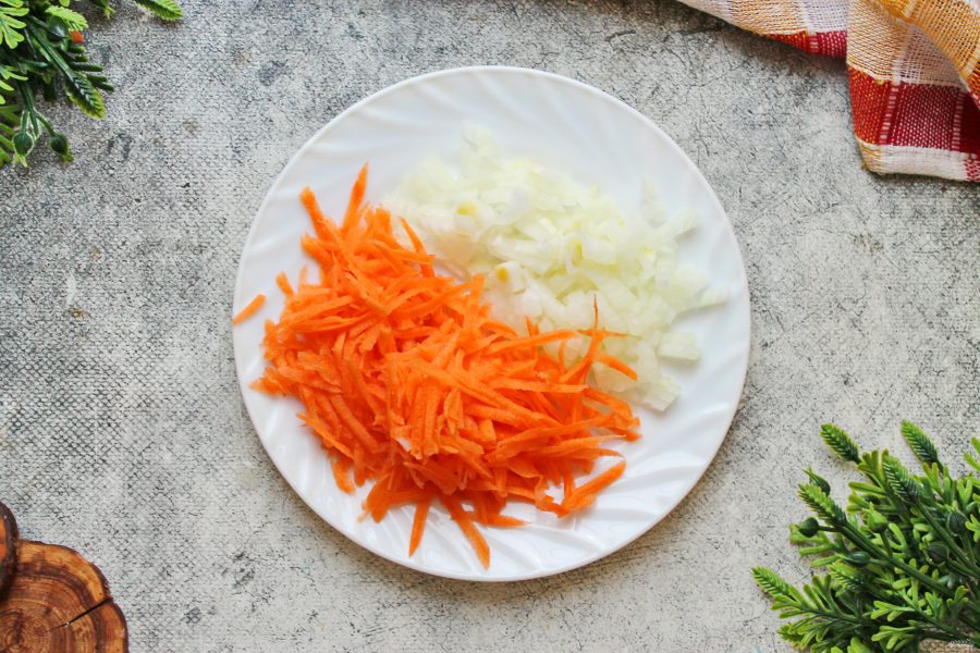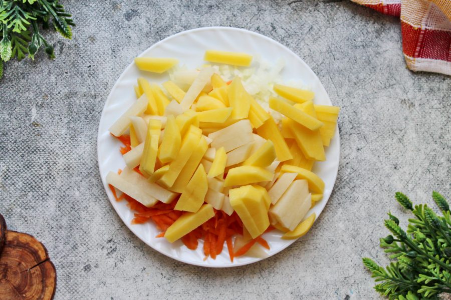 Подготовьте все необходимые ингредиенты для приготовления "Молдавской Замы". Морковь, картофель и репчатый лук почистите и вымойте.