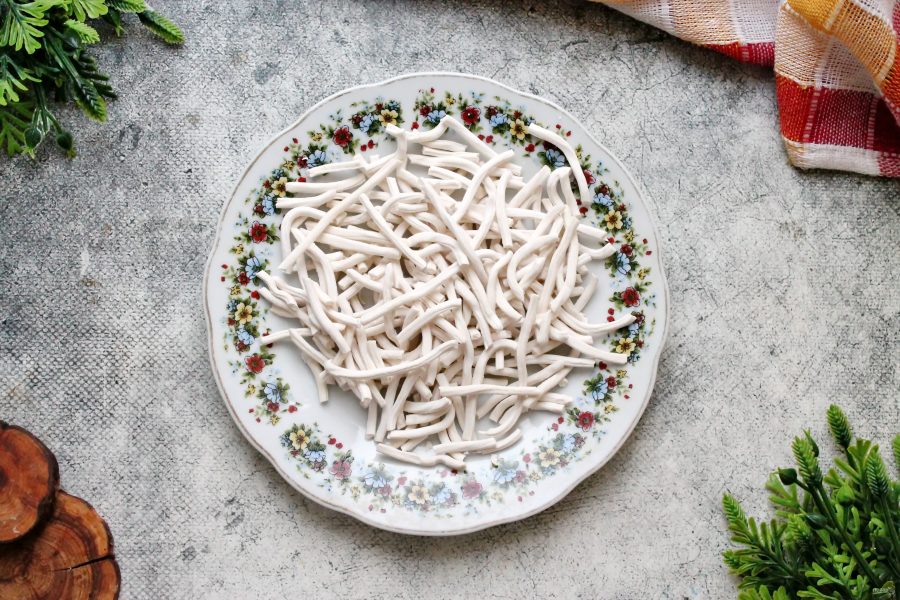 Опустите лапшу в кипящий суп и варите 5 минут, перемешивая.