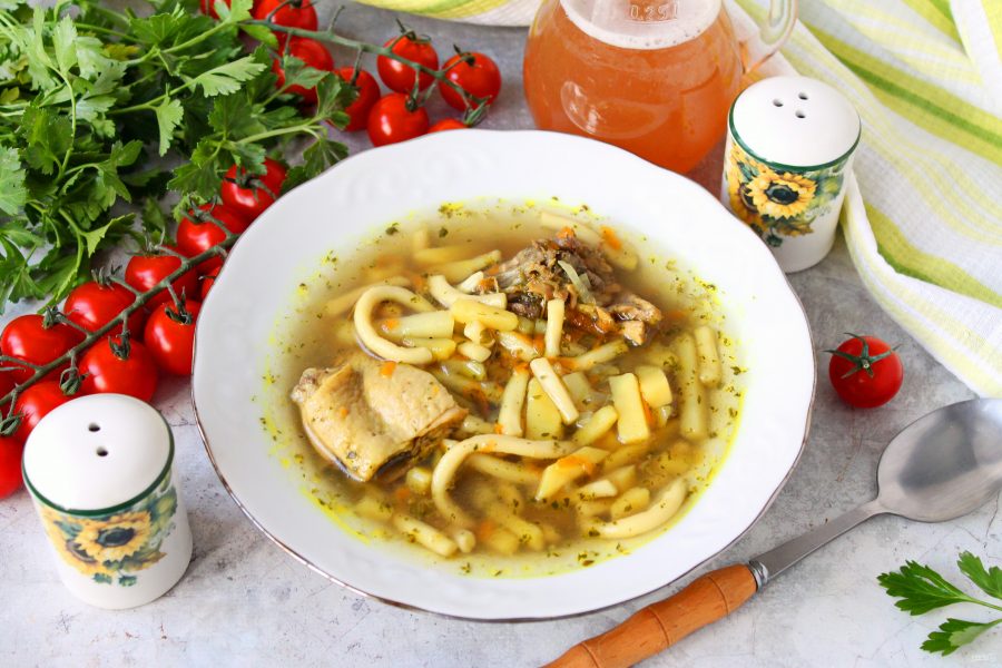 Выложите в суп лавровый лист, зелень и варите еще несколько минут до готовности лапши. Разлейте суп по тарелкам и подавайте на стол.