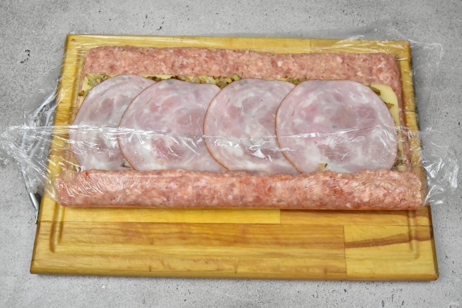 С помощью пищевой пленки скрутите мясной фарш с начинкой в тугой рулет.