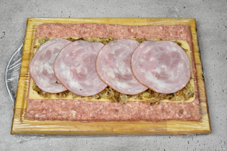 Заключительным слоем начинки, разложите ломтики ветчины.