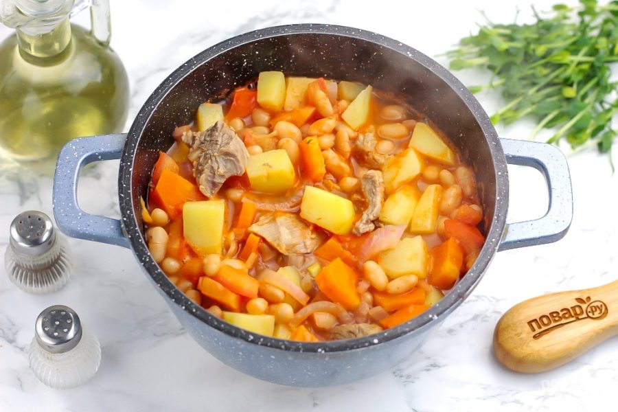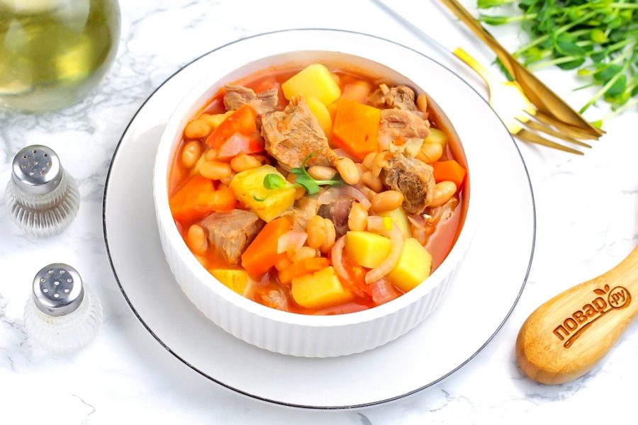 Сочное мясо с консервированной фасолью полностью готово! При желании можно вмешать в него измельченную зелень укропа, петрушки или кинзы.
