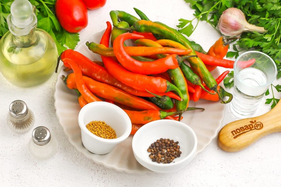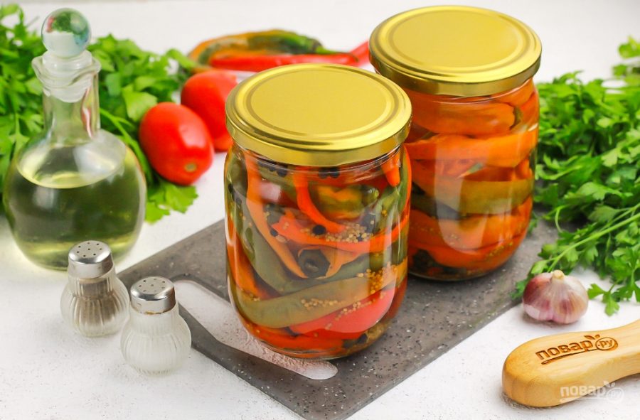 Расчет ингредиентов указан на две емкости по 500 мл. Любителям жгучего вкуса нет жизни без острого маринованного перца в зимнее время. Особенно вкусен он с борщом, рассольником, супом харчо и т.д., а как ароматен и шикарен шашлык вприкуску с таким перцем! Мариновать закуску из перца на зиму легко и просто, главное проявить осторожность в работе с этим ядреным овощем. Его мякоть может обжечь руки и слизистые, поэтому лучше всего работать в перчатках. Вам понадобится всего лишь 20 минут, чтобы баночки с красочной заготовкой ждали своего часа для отправки в кладовую.Состав / Ингредиенты: